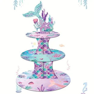 TEMU 3-poziomowy stojak na babeczki w kształcie Syreny wraz z zestawem topperów na babeczki Syreny, idealny na urodziny, z dekoracją w wieży