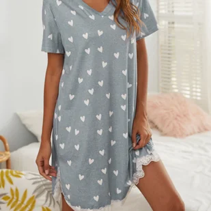 Sukienka nocna damska z nadrukiem serca, z koronkową lamówką, krótki rękaw, luźny krój, wygodna koszula nocna