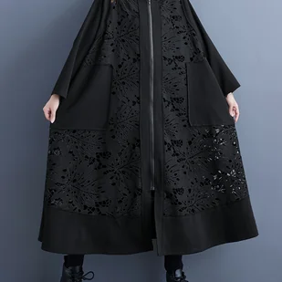TEMU Japonka w stylu patchworku, długa, codzienna kurtka trenchcoat z koronką, uniwersalna i luźna, modna czarna kurtka z kapturem