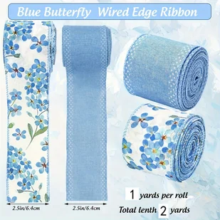 TEMU 1 zestaw 2 rolek niebieskiej wstążki z motywem kwiatowym i motylim z drutowaną krawędzią, poliestrowa dekoracyjna wstążka rzemieślnicza na