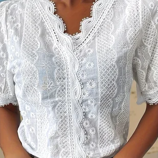 TEMU 2024 Nowość - Elegancka biała koronkowa bluzka z wycięciem w kształcie litery V i krótkim rękawem dla kobiet, z dekoltem w kształcie falbanki,