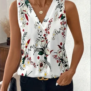 TEMU Bluzka bez rękawów dla kobiet z kwiatowym nadrukiem - Biała z kolorowymi kwiatami i zielonymi liśćmi, Dekolt w kształcie litery V, Idealna na