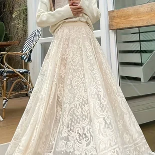 TEMU Elegancka długa spódnica dzianinowa z koronkowymi detalami - Kolekcja wiosna/jesień