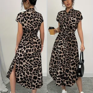 TEMU Elegancka Sukienka Midi w Lamparcie Wzory dla Kobiet - Krótki Rękaw, Wysoki Niski Dół, Zapinana na Guziki, Możliwość Prania w Pralce, Idealna do