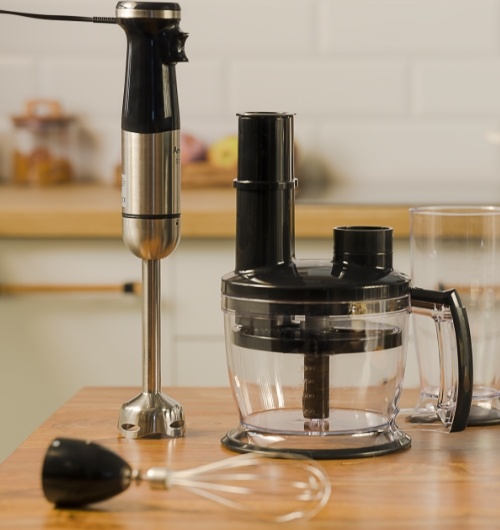 Elementy blendera, które można myć w zmywarce to: pojemnik 800ml, końcówka rozdrabniająca oraz 3 rodzaje noży.