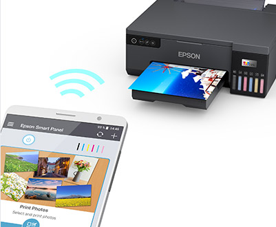 Model L8050 umożliwia łatwe drukowanie z telefonów, tabletów i laptopów. Obsługa łączności Wi-Fi i Wi-Fi Direct umożliwia przesyłanie dokumentów do wydrukowania wprost z urządzeń mobilnych przy użyciu aplikacji Epson Smart Panel3.