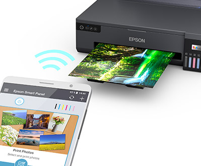 Model L18050 umożliwia łatwe drukowanie z telefonów, tabletów i laptopów. Obsługa łączności Wi-Fi i Wi-Fi Direct umożliwia przesyłanie dokumentów do wydrukowania wprost z urządzeń mobilnych przy użyciu aplikacji Epson Smart Panel3.